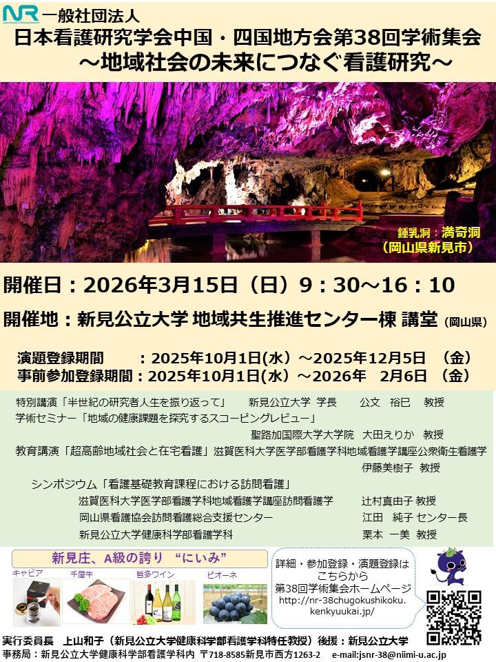 令和7年度の第38回中国・四国地方会学術集会は、令和8年3月15日(日)に新見公立大学(岡山県新見市)で開催いたします。